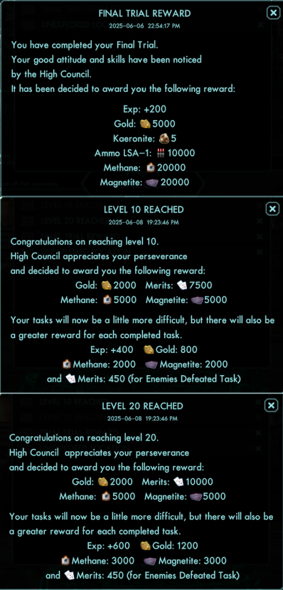 Increased rewards for completing the Final Trial, reaching level 10 and 20