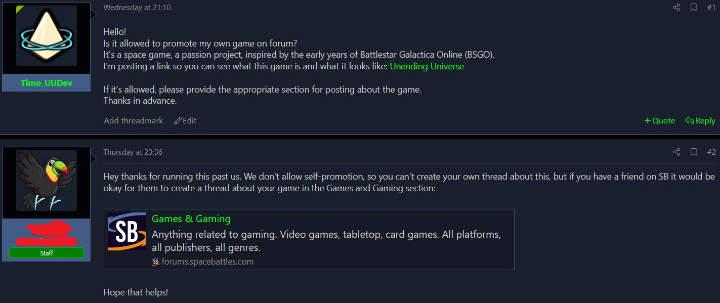 I'll tell you, I've encountered a very strange (but probably quite common) situation where self-promotion is prohibited in many such places (for example here: https://forums.pcgamer.com/ or here: https://forums.spacebattles.com/).